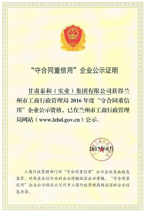 日前,蘭州市工商行政管理局對2016年度“守合同重信用企業(yè)”進行了公示。甘肅泰和實業(yè)(集團)有限公司(以下簡稱“泰和集團”)憑借良好的企業(yè)信譽,獲得了2016年度蘭州市“守合同重信用”企業(yè)榮譽稱號。