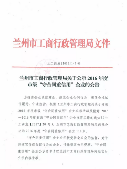 附:蘭州市工商局關(guān)于公示2016年度市級“守合同重信用”企業(yè)公告