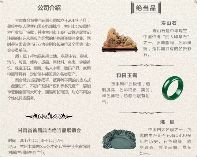 此次展銷會(huì)有全省和北京、深圳等二十多家企業(yè)積極響應(yīng)參展,展品大到房屋、車輛,小到黃金飾品、名表、字畫、文玩等。甘肅泰合慧典當(dāng)有限公司本次展品包含絕當(dāng)商鋪和房屋、中國傳統(tǒng)“四大印章石”之一的壽山石、種質(zhì)極佳的和田玉鐲、中國四大名硯之一的洮硯。