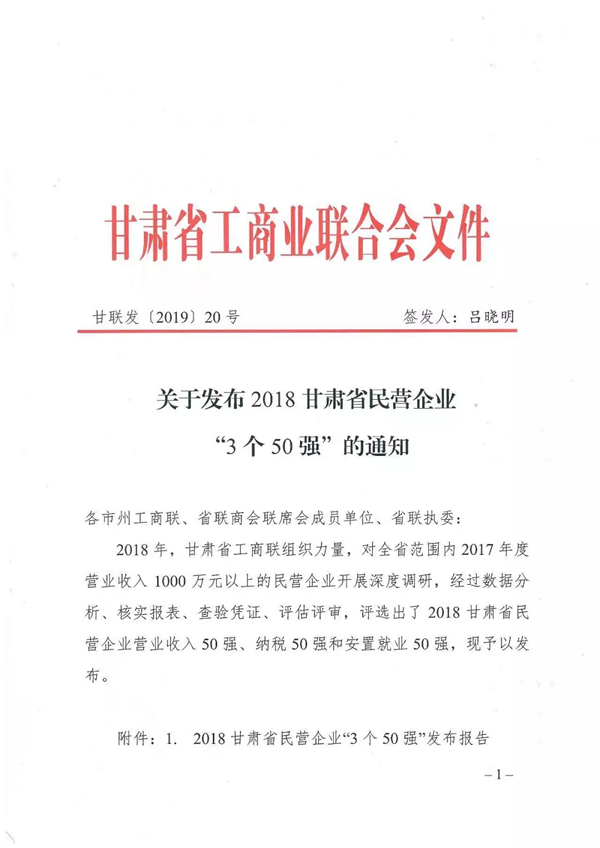 2018年甘肅省工商聯(lián)組織力量,對全省范圍內(nèi)2017年度營業(yè)收入1000萬元以上的民營企業(yè)開展深度調(diào)研,經(jīng)過數(shù)據(jù)分析、核實報表、查驗憑證、評估評審,評選出了2018甘肅省民營企業(yè)營業(yè)收入50強、納稅50強、安置就業(yè)50強。