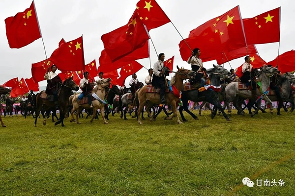 上午10時(shí)許,隨著高云龍宣布第二十屆九色甘南香巴拉旅游藝術(shù)節(jié)開幕,由千匹駿馬、千名騎手組成的馬隊(duì)如騰飛的巨龍一般從主席臺(tái)前飛馳而過,象征著偉大祖國(guó)從站起來、富起來到強(qiáng)起來光輝歷程的71面五星紅旗在會(huì)場(chǎng)迎風(fēng)飄揚(yáng)……