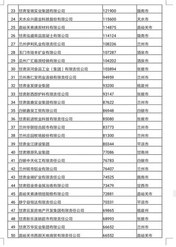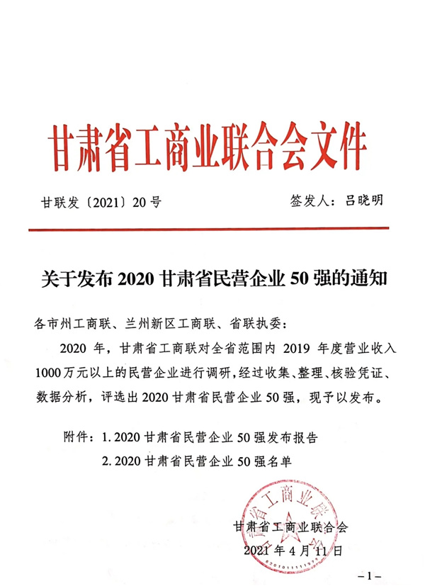 2020年,甘肅省工商聯(lián)對(duì)全省范圍內(nèi)2019年度營(yíng)業(yè)收入1000萬元以上的民營(yíng)企業(yè)進(jìn)行調(diào)研,經(jīng)過收集、整理、核驗(yàn)憑證、數(shù)據(jù)分析,評(píng)選出2020甘肅省民營(yíng)企業(yè)50強(qiáng)。4月13日上午,甘肅省工商業(yè)聯(lián)合會(huì)(民間商會(huì))十二屆五次執(zhí)委會(huì)議上發(fā)布了2020甘肅省民營(yíng)企業(yè)50強(qiáng)名單,我司榮登榜單,位列第16位。