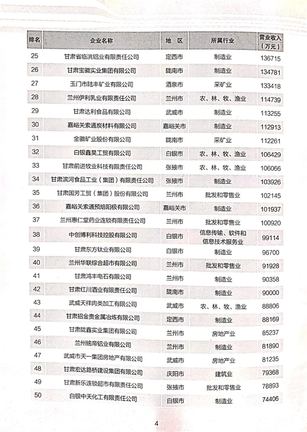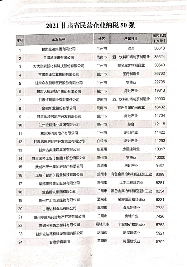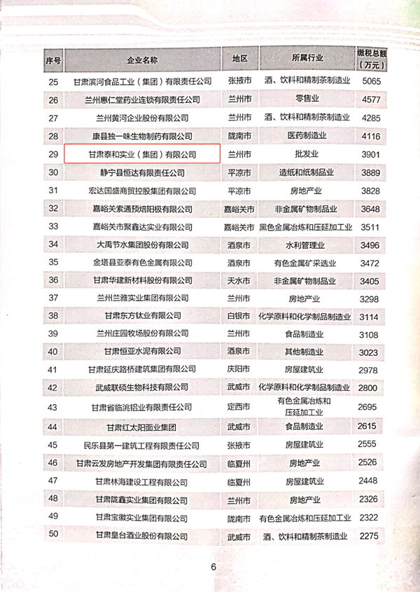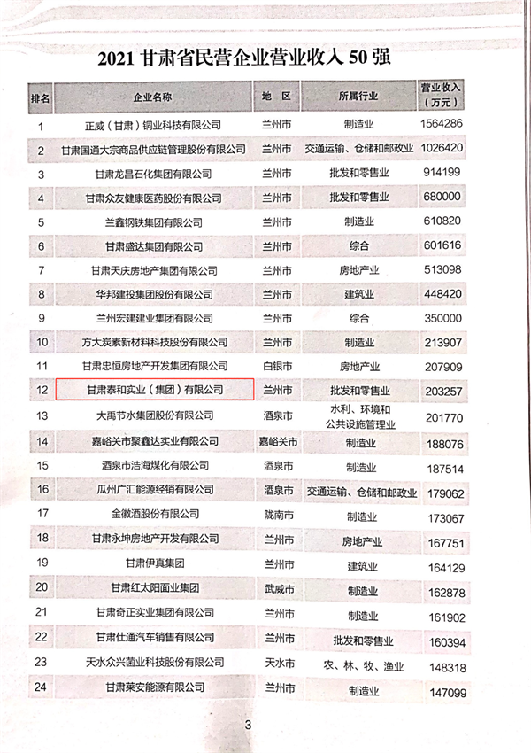 2021甘肅省上規(guī)模民營企業(yè)調(diào)研,共有321 家年營業(yè)收入1000 萬元以上的民營企業(yè)參加,經(jīng)各級工商聯(lián)及相關(guān)單位收集、整理、數(shù)據(jù)分析、審核通過,形成 2021 甘肅省民營企業(yè)營業(yè)收入、納稅、安置就業(yè)50強。2月21日,甘肅省工商業(yè)聯(lián)合會(總商會)十二屆六次執(zhí)委會議上發(fā)布了2021甘肅省民營企業(yè)“3個50強”名單,甘肅泰和實業(yè)(集團)有限公司榮登榜單,位列營業(yè)收入50強第12位、納稅50強第29位。