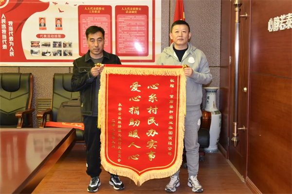 為響應(yīng)“萬企興萬村”蘭州行動村企結(jié)對興村工作,集團領(lǐng)導(dǎo)深入永登縣兌角村考察調(diào)研,詳細了解該村亟待解決的困難。在了解到該村農(nóng)田灌溉難問題后,捐款3萬元人民幣用于該村農(nóng)業(yè)灌溉井施工項目。12月29日,兌角村黨支部書記、村委會主任趙發(fā)軍一行2人,為泰和集團送來了一面寫有“心系村民辦實事 愛心捐助暖人心”的錦旗,對泰和集團的善舉表示感謝。